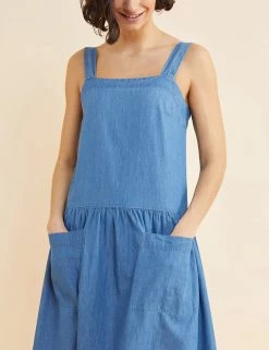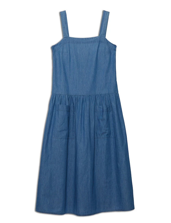 With its easy shape and pure cotton denim fabric, this Albaray pinafore dress is made for off-duty dressing. It’s cut in comfy regular fit with a drop waist. Broad straps and a square neckline give the straight bodice a casual look. The midi-length skirt is gathered for extra fullness, and is finished with two handy patch pockets at the front.