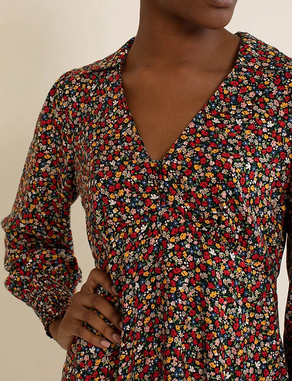 This mini swing dress from Albaray is big on details. It’s cut to a regular fit, with a flattering collared v-neck and seaming under the bust. Elasticated cuffs add extra volume to the long sleeves, and the ditsy floral print has a vintage feel. Made with sustainably sourced viscose.