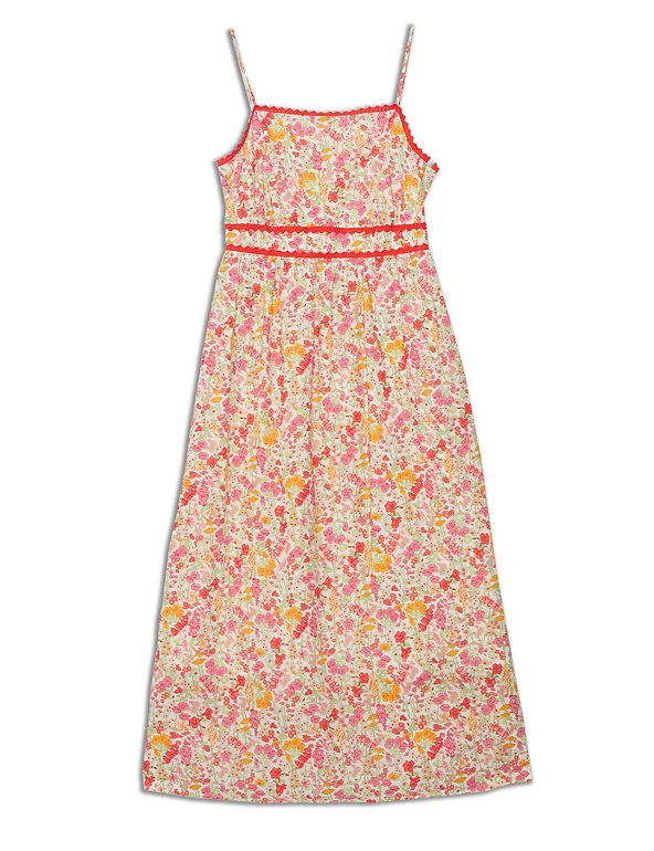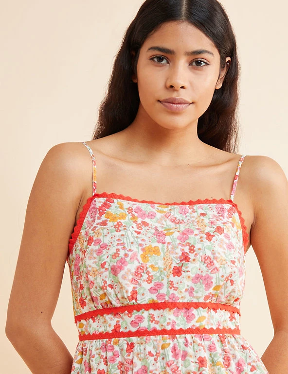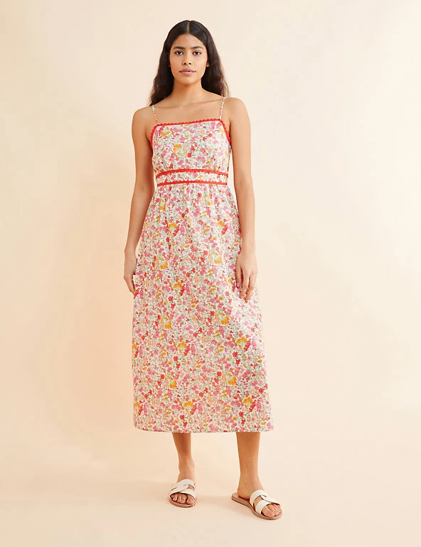 This summer shift dress from Albaray is crafted in cool pure cotton for effortless wear. Designed in a regular fit, this strappy piece falls to a flattering midi length. Its retro-inspired floral print and contrast lace detailing around the waist combine with a modern square neck for a feminine finish. Made with organic cotton.