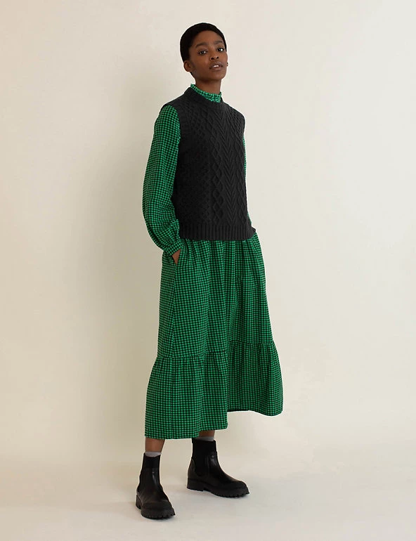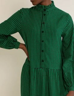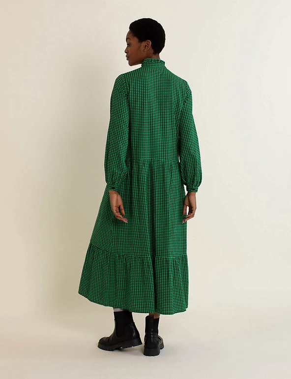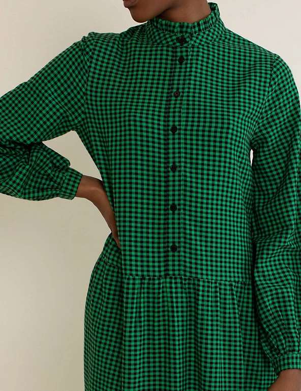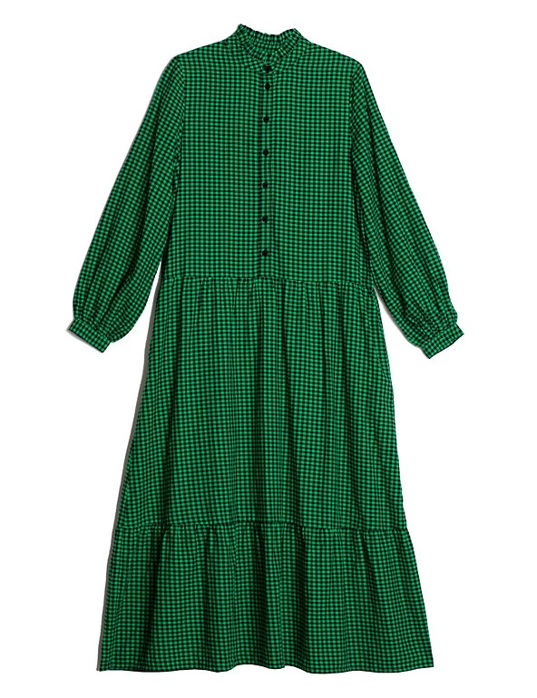 This pure cotton Albaray swing dress adds charm to your collection with its classic gingham checks. It’s designed in a regular fit with a gathered midi-length skirt and a tier at the hem for swishy movement. It fastens with buttons along the front leading to a flattering drop waist. The dress is framed with an elegant frilled high collar and long blouson sleeves.