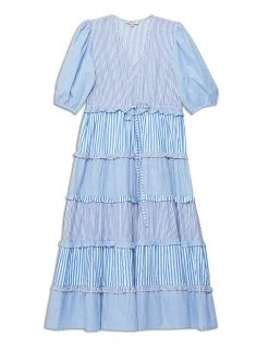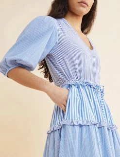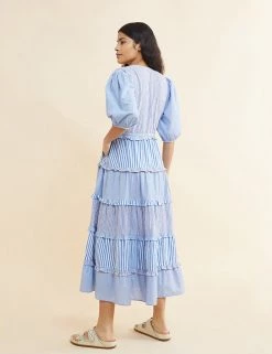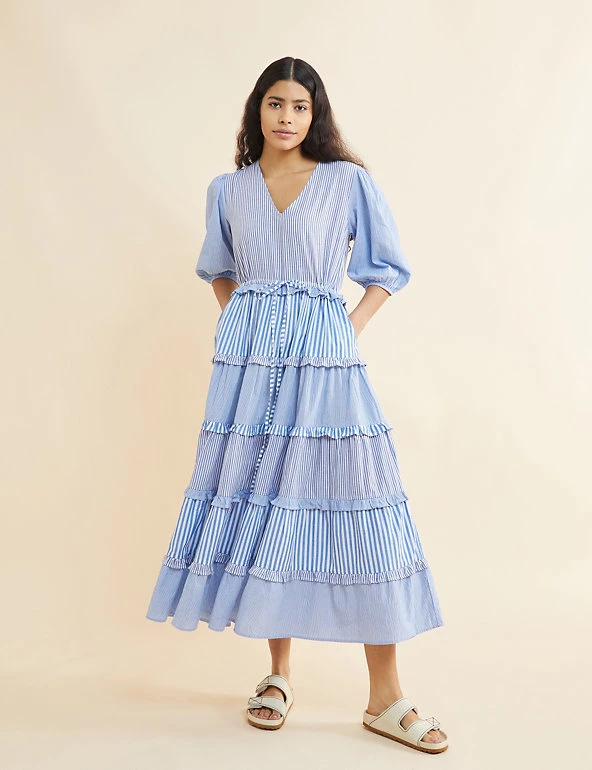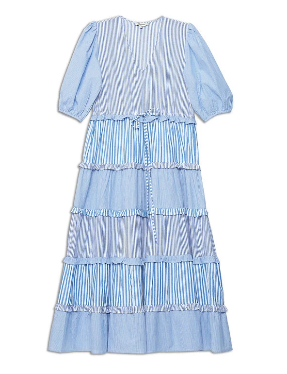 Channel breezy elegance in this pure cotton midi dress from Albaray. It’s made in a comfortable regular fit, with a feminine v-neckline and a full tiered skirt that features contrasting frills at each tier. The elbow-length sleeves are gathered at the cuffs to give an on-trend puffed shape. A mix of vertical striped prints ensures a crisp, fresh feel.