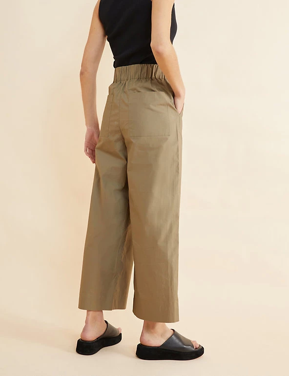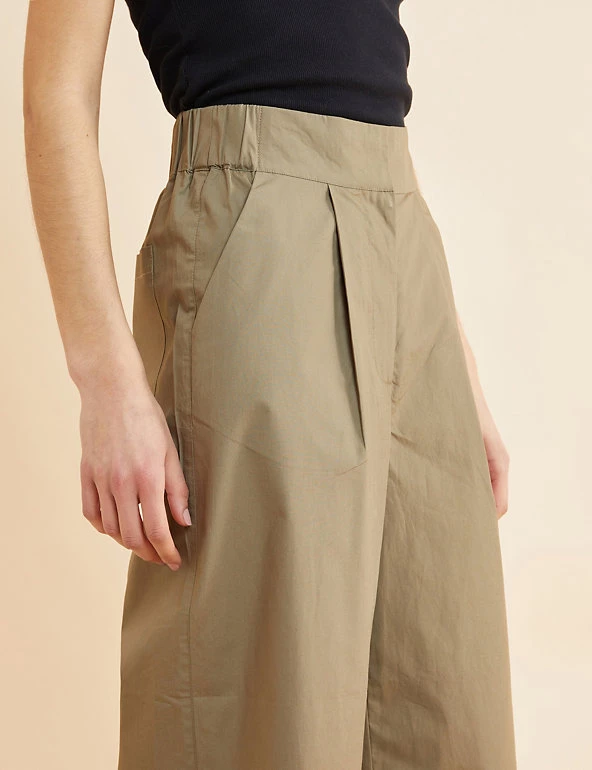 Keep your cool on sunny days in these pure cotton trousers from Albaray. Their wide leg shape make them a perfect pick for summer, while their mid-rise waistline ensures a comfortable wear. Pockets at the hips provide useful storage, and a button and zip fastening creates a neat look. Made with organic cotton.