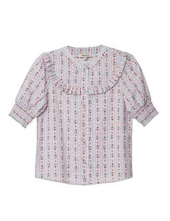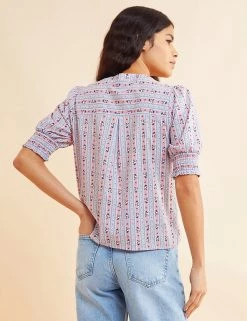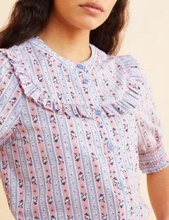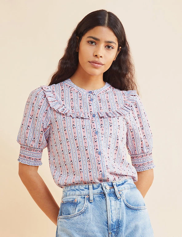 With its pure cotton fabric, this pretty Albaray blouse is a lovely choice for warmer weather. It’s cut in a comfy regular fit, with a simple collarless neckline and button-up fastenings. A dainty striped print ensures a fresh and pretty feel. The short sleeves are shirred for a neat look, and a frill on the yoke adds feminine detail. Made with organic cotton.
