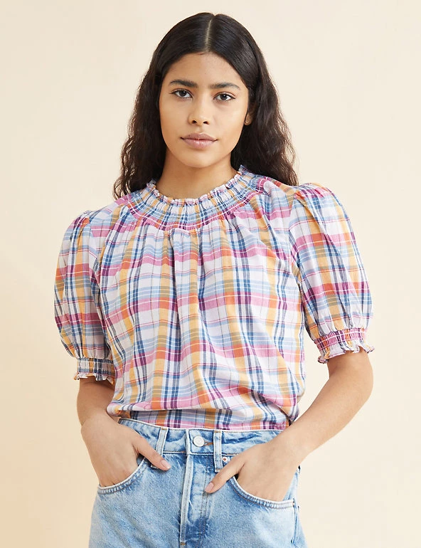 Evoke some prairie-inspired charm with this pure cotton checked top by Albaray. It’s cut in a comfy regular fit, with a shirred high neckline. Elasticated cuffs create a short puff-sleeve silhouette.