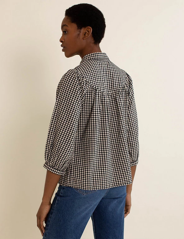 Bring a prairie vibe to your smart-casual ensembles with this gingham top from Albaray. It’s cut in a comfy regular fit with three-quarter puff sleeves and a seam around the yoke for extra shaping. This versatile piece is crafted from breathable pure cotton and has a collared neck and button-through closure.