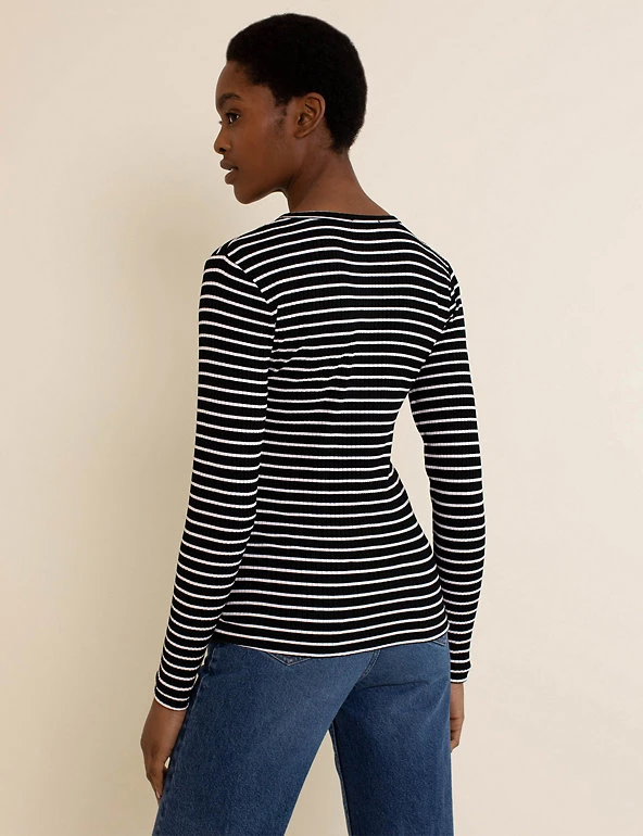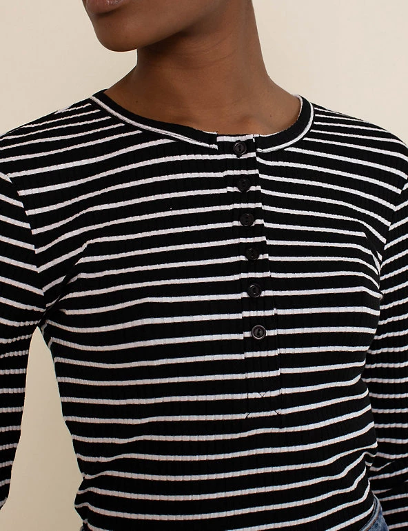 Go classic on off-duty days with this long-sleeved stripey top from Albaray. It’s cut in a comfy regular fit from cosy ribbed fabric with added stretch for easy movement. The crew neck and buttoned placket add a smart finish. Made with sustainably sourced viscose.