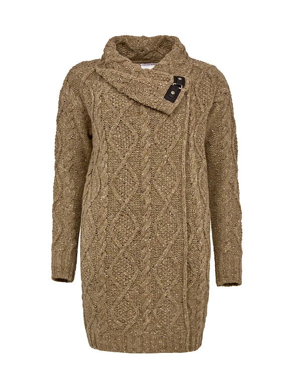 Wrap up in this cosy Celtic & Co. cardigan, knitted from pure wool. The longline style comes in snug cocoon shape, which fastens at the side with a statement buckle detail. A shawl-like collar creates a comfy nest around the neck. It’s spun with flecked yarn featuring an all-over cable knit for a traditional look.