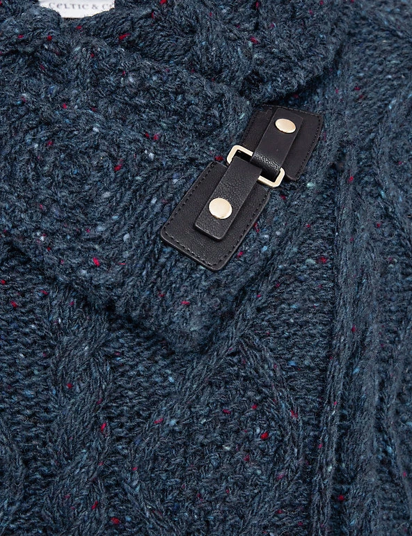 This pure wool Celtic & Co coatigan combines the cosiness of a cardigan with the practicality of a coat. It’s cut to a regular fit, with a cosy funnel neck and buckle fastening. The chunky, cable knit design adds to the snug look and feel.