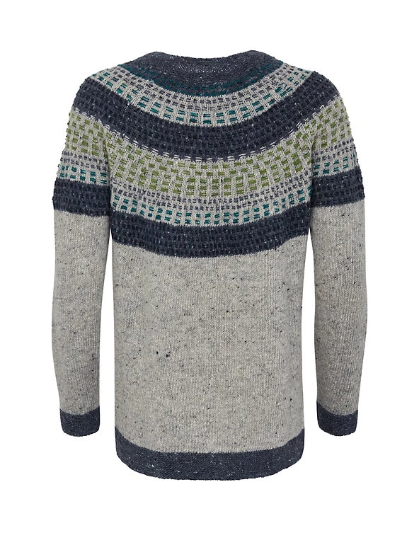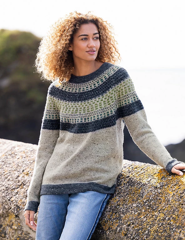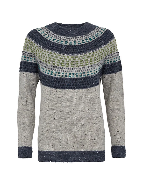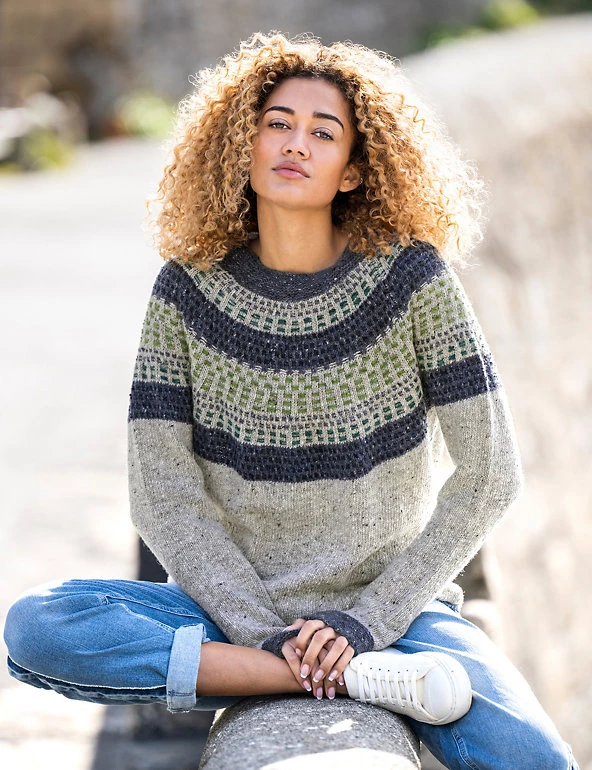 Bring an authentic touch to your cold-weather uniform with this crew neck jumper from Celtic & Co. It’s designed in a comfy regular fit for all-day comfort with a textured purl knit at the crew neck. This pure wool piece is knitted from Donegal yarns which have been spun and dyed in Ireland to achieve unique flecks and neps. Float stitching around the collar in contrast colours adds extra character.