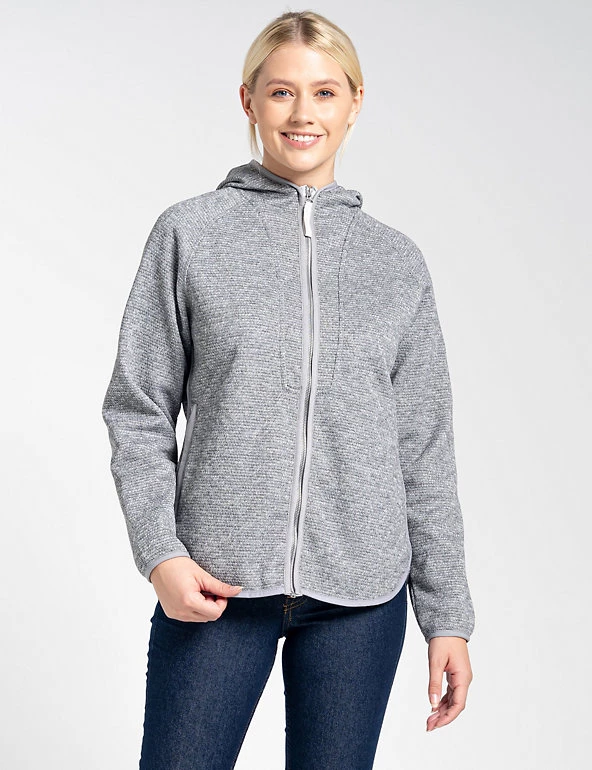 This textured fleece jacket from Craghoppers is perfect for active days. It’s designed in a comfy relaxed fit, with a handy hood and a stylish, curved hem. Two side pockets will keep your essentials close and a zip fastening means it’s ideal for layering. Made with recycled polyester.