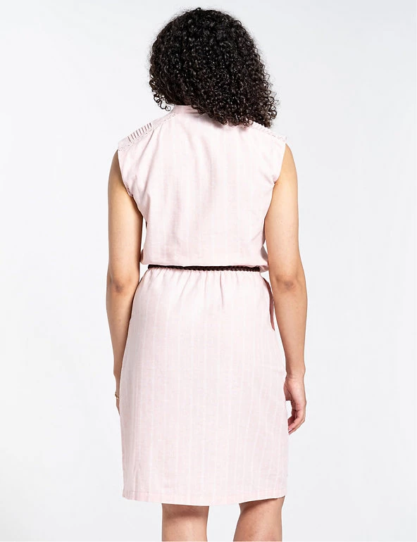 This tailored linen-blend dress from Craghoppers will see you through the summer in style. It’s crafted in an effortless regular fit, and has a cool sleeveless shape and a comfortable elasticated waist. A subtle self-stripe pattern and utility-inspired pockets give this piece a timeless look, while the cotton-linen blend makes it naturally breathable. This piece is finished with feminine crochet detailing on the shoulders, plus a belt and practical pockets, one of which is a zipped security pocket.