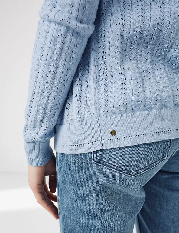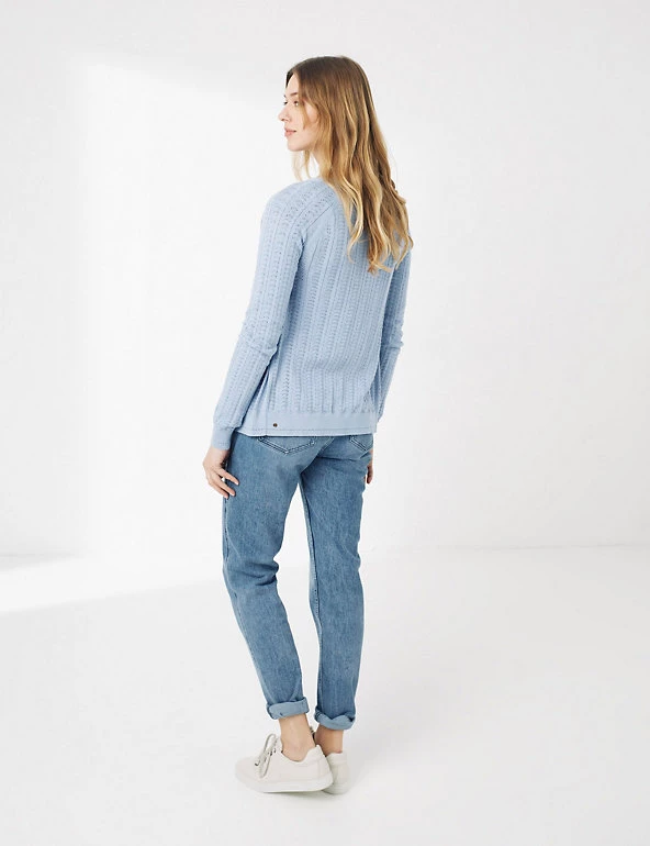 This pure cotton cardigan from FatFace is full of texture and detail. Designed in a regular fit, this long-sleeved style features a classic v-neck and ribbed trims for a snug feel. Intricate pointelle stitching gives this piece a traditional look, and it’s finished with contrast tortoiseshell button fastenings.
