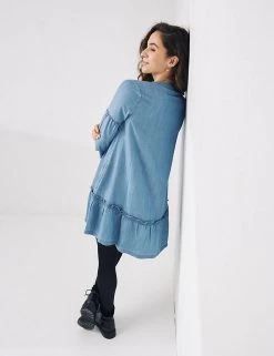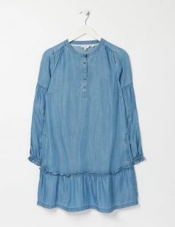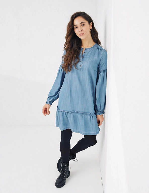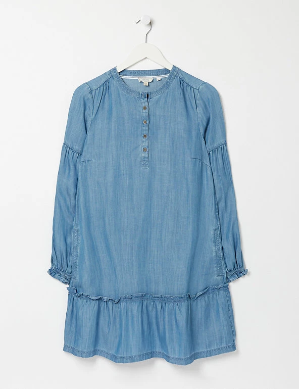 This pure Tencel™ dress from FatFace brings extra femininity to your off-duty wardrobe. It’s cut in a comfortable regular fit, in an unstructured swing shape that ensures a loose, laid-back silhouette. The easy round neckline is fastened with buttons for added detail. A deep frill gives pretty movement at the knee-length hemline. The long sleeves are panelled to enhance the casual feel and are finished with snug elasticated cuffs. Made with sustainably sourced Tencel™ lyocell.