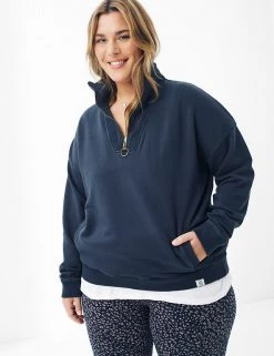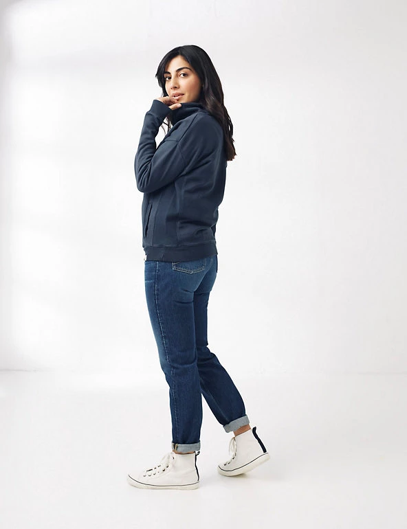 This cotton-rich sweatshirt from FatFace keeps you snug in effortlessly casual style. It’s made in a comfortable regular fit, with a high funnel neckline and a half-zip fastening so you can adjust your warmth levels. Vertical pockets at the waist keep your valuables safe, while ribbing at the cuffs and waistband shuts out draughts. An oversized round zip-pull adds a fun finishing touch.