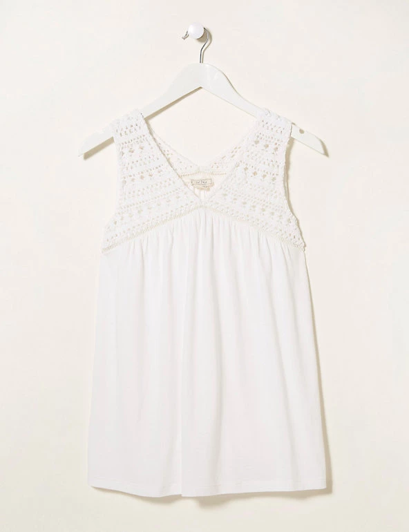 Take it easy in style with this classic top from FatFace, crafted from a premium cotton-modal blend. This sleeveless design is cut to a regular fit for a casual look and features a flattering v-shaped neck. Intricate macrame detail around the neckline adds a pretty feel, plus it’s finished with a button fastening.
