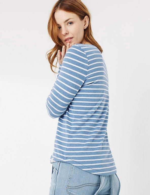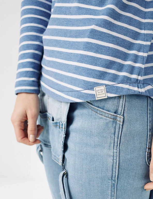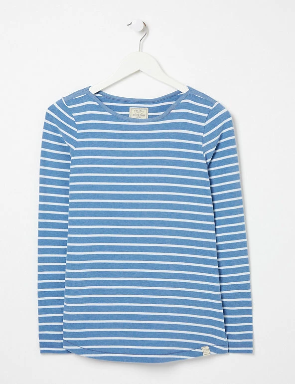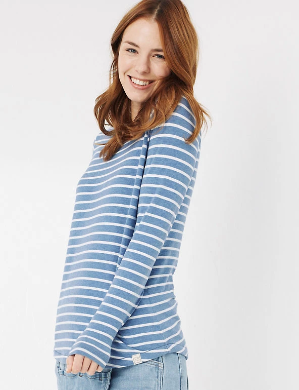 This striped top from FatFace is crafted from cotton-rich fabric for exceptional comfort. It’s cut in a regular fit, with long sleeves and a round neck for a classic finish. The elegantly curved hem is longer at the back for flattering shaping and has a branded tab stitched on the front for extra detail. Made with organic cotton.