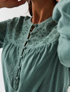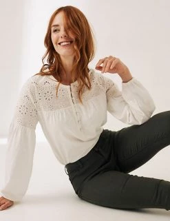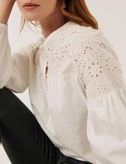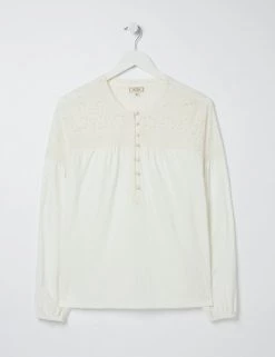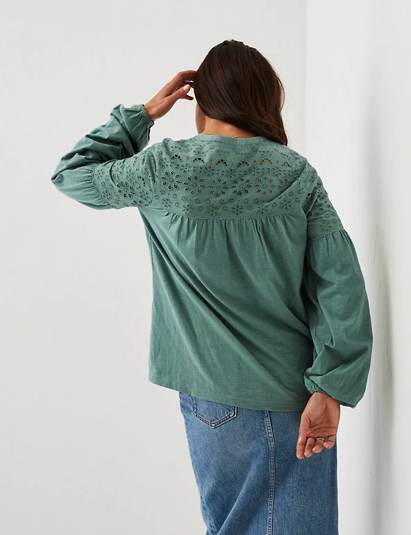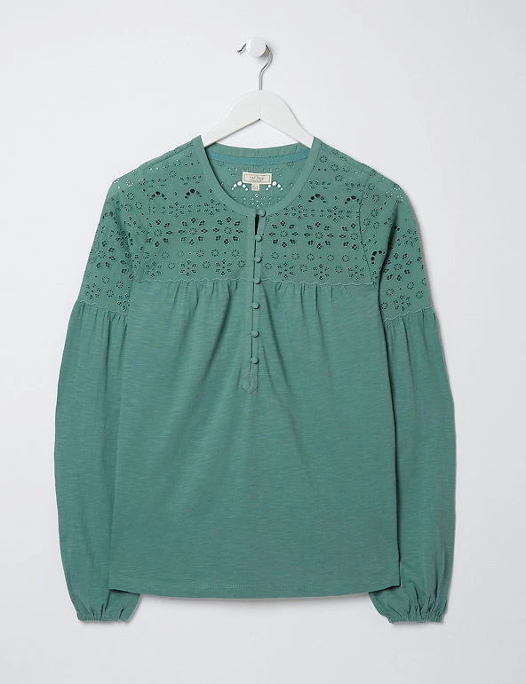Crafted from pure cotton with broderie anglaise detailing, this FatFace top will bring a feminine vibe to off-duty days. It’s cut to a comfy regular fit, with a neat round neck and fabric buttons down the chest. The voluminous long sleeves end in stretchy cuffs to hold them in place.