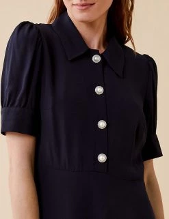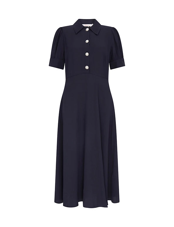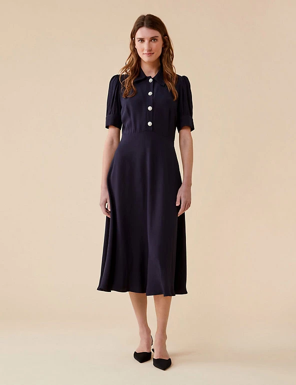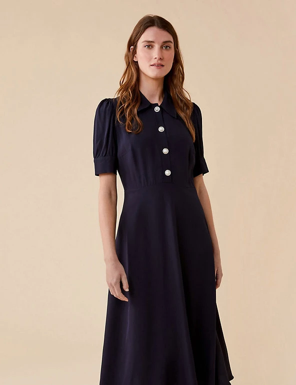 This Finery London midi dress has a stylish vintage-inspired feel. It’s cut to a flattering regular fit, with short puff sleeves and a chic collar. A waisted detail enhances the silhouette, and large pearl-look buttons give this piece an eye-catching finish.