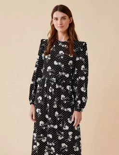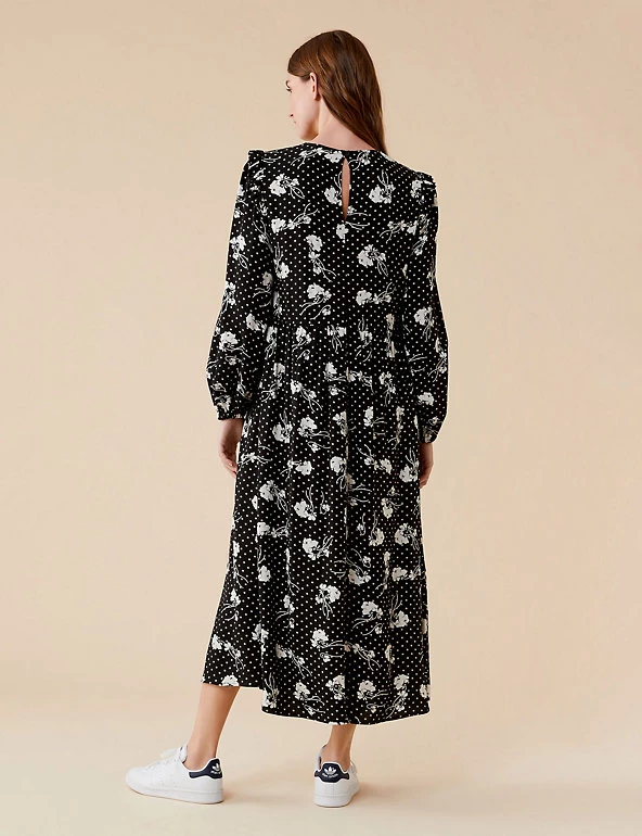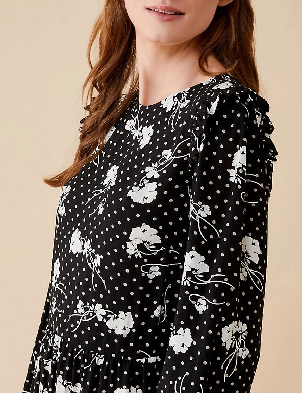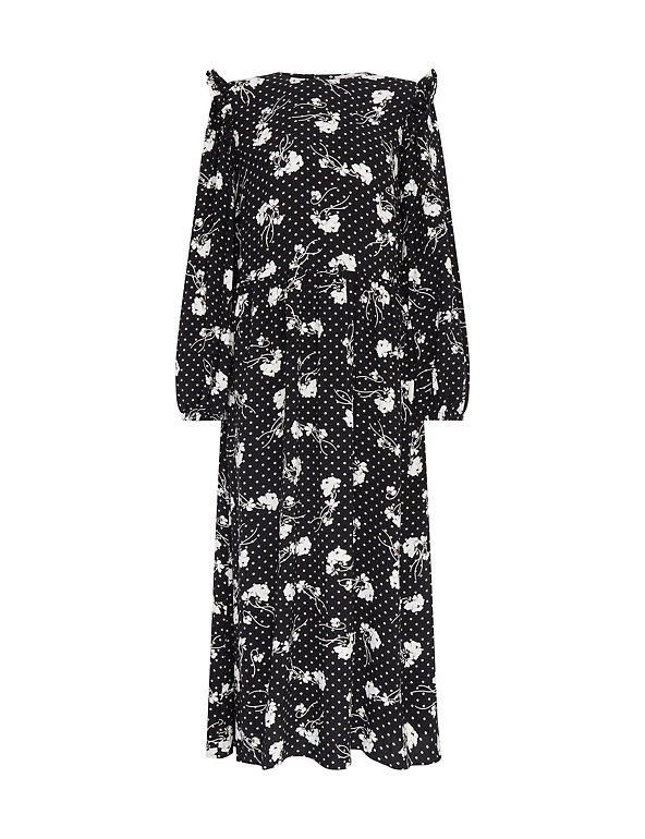 Embrace the monochrome look with this modern tea dress from Finery London. This effortless midi is cut to a regular fit and has flattering long sleeves and a seam detail around the waist. A mix of florals and polka dots gives this piece a unique feel, and frill detailing on the shoulders adds a feminine touch. This style fastens with a zip.