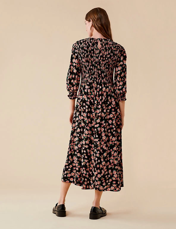 This Finery London dress flourishes with romantic florals. Cut in a regular fit, it hugs the body with stretchy shirring detail, before falling into a flowy midi skirt. Puffed 3/4-length sleeves with shirred cuffs bring a touch of volume to its silhouette. The dress is complete with a neat back button fastening.