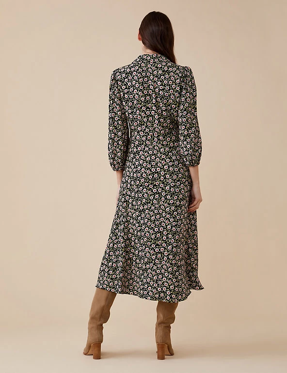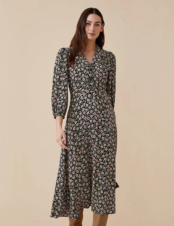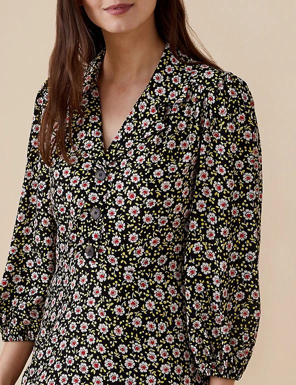 This floral tea dress from Finery London is a fresh and contemporary take on a traditional style. It’s cut in a comfortable regular fit, with a wide revere collar that emphasises the feminine v-neckline. Three-quarter blouson sleeves ensure an on-trend feel, and chunky mock-horn buttons on the bodice add extra detail. The hem finishes at a versatile midi length and the dress fastens with a zip.