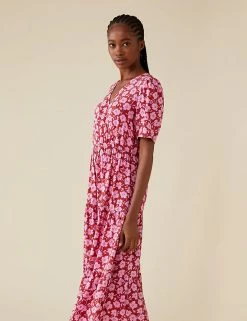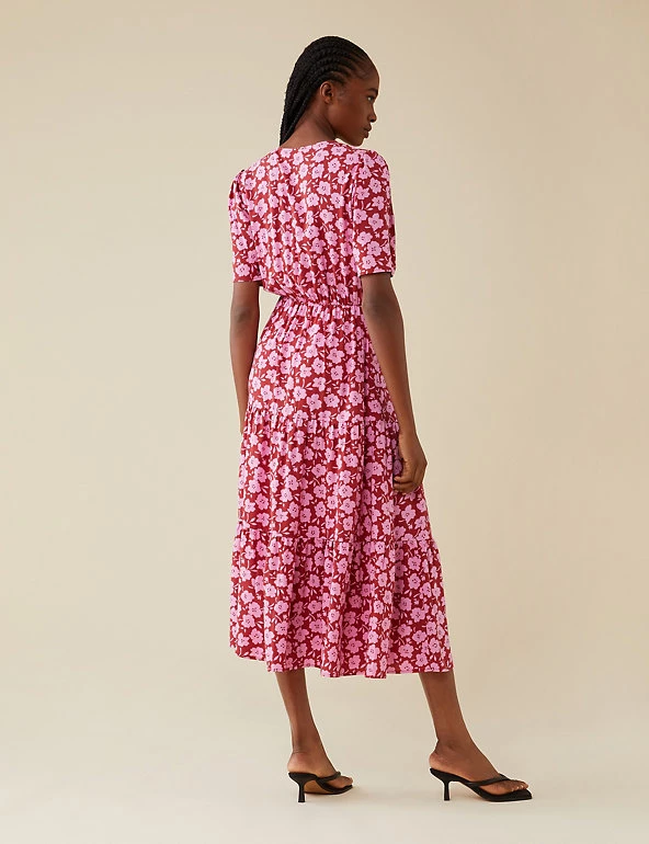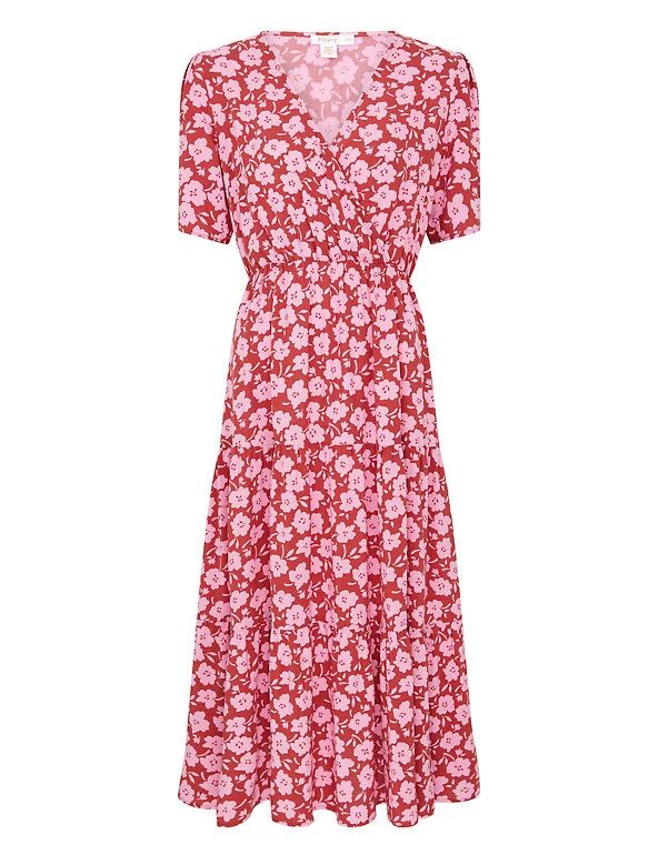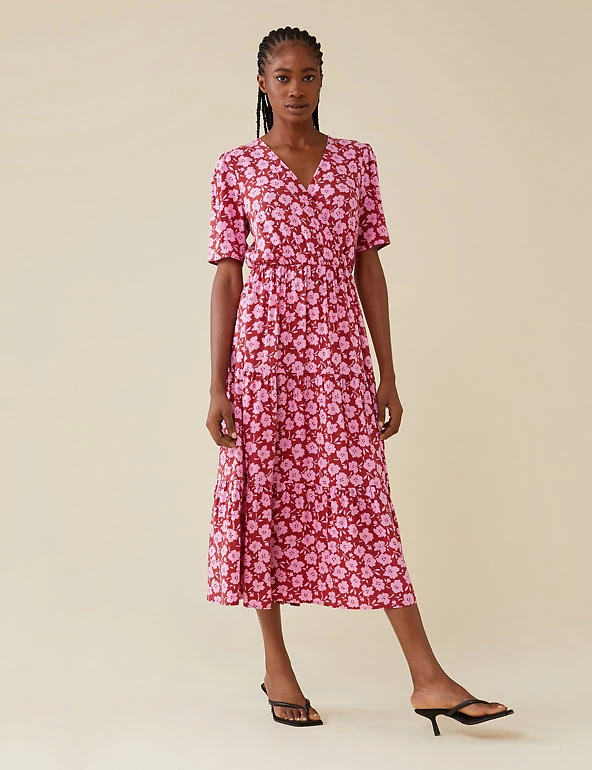 Flourish in florals at your next outing with this eye-catching midi dress by Finery London. It’s cut to a regular fit, with an elegant wrap front and a swishy tiered skirt. This dress is complete with short sleeves that are lightly gathered at the shoulder for gentle volume.