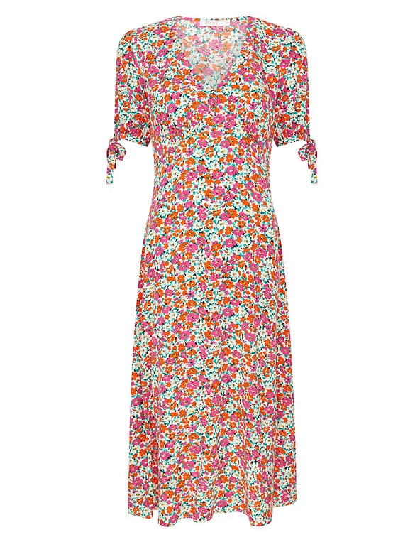 Let this vibrant Finery London tea dress fill your warm-weather wardrobe with summery flowers. The bodice of this regular-fit dress skims the body before flowing into a midi-length skirt. Gentle gathering flatters the bust. The deep v-neckline is offset by tie-detail puff sleeves.