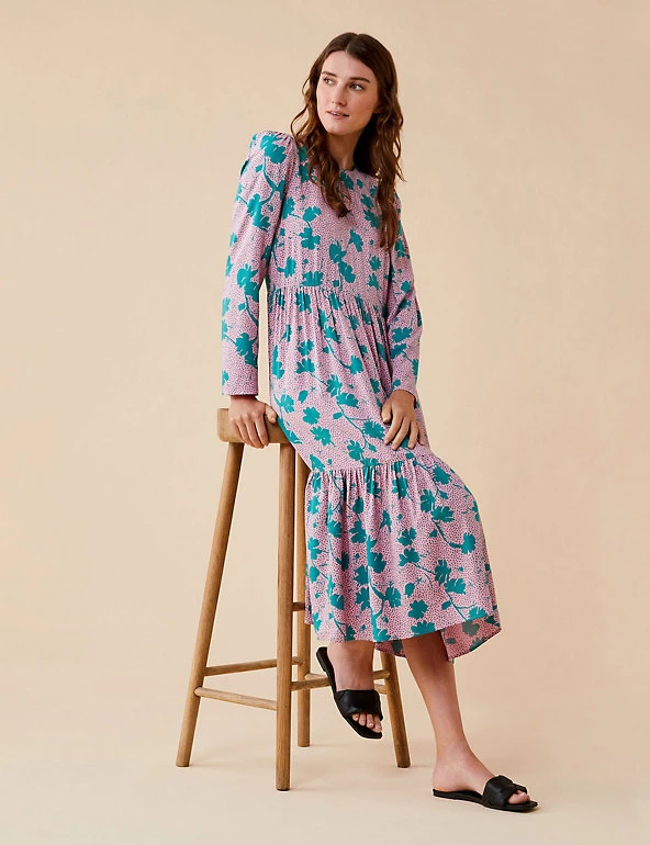 Equal parts vibrant and comfortable, this pretty leaf-print dress by Finery London makes a stylish pick for any occasion. This eye-catching midi-length piece is made in a regular fit and sports a classic round neck and long sleeves. Tiered detailing along the waist and hem adds a vintage-inspired finish to this colourful dress.