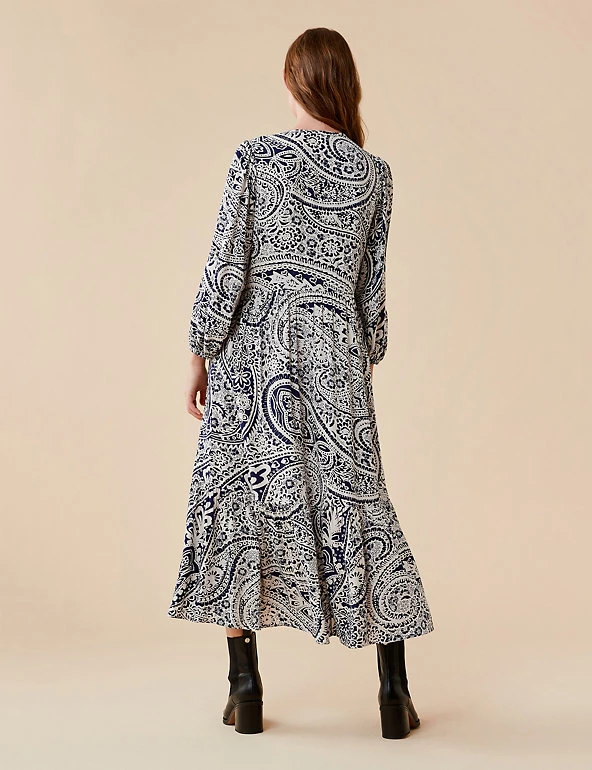 Reach for this paisley-print dress by Finery London for your next warm-weather outing. The regular-fit style is crafted in an easy-breezy tiered silhouette that falls to a midaxi length. Puffed sleeves and a tie neck add a touch of romance to this summery piece.
