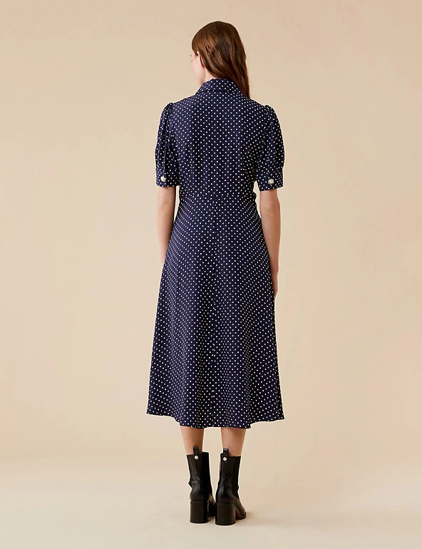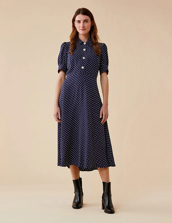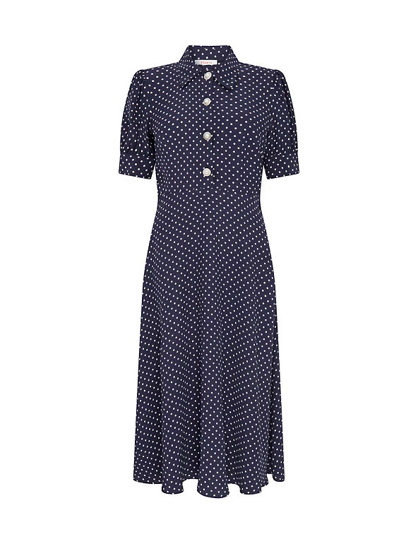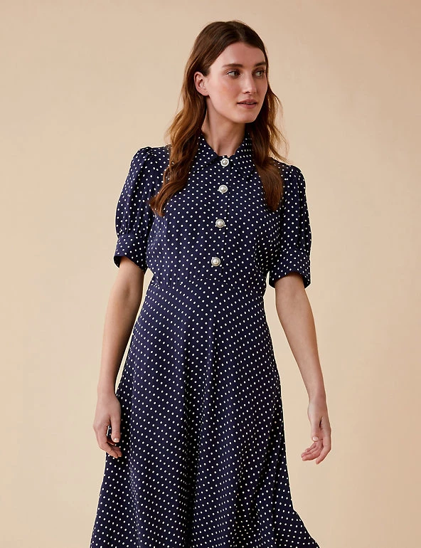 With a polka dot print and mother-of-pearl buttons, this Finery London dress is all about classic elegance. It comes in a figure-skimming regular fit, with a swishy midi-length skirt. A neat collar neckline and short puffed sleeves add a touch of traditional finesse.
