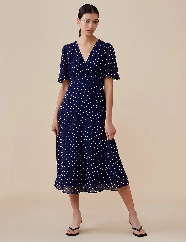 This polka dot tea dress from Finery London combines effortless style and comfort. It’s designed in a regular fit, with a flattering wrap-style v-neck and an on-trend midi hem. Floaty short sleeves add a feminine finish to this printed piece. This style fastens with a concealed centre back zip.