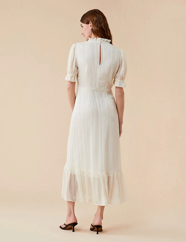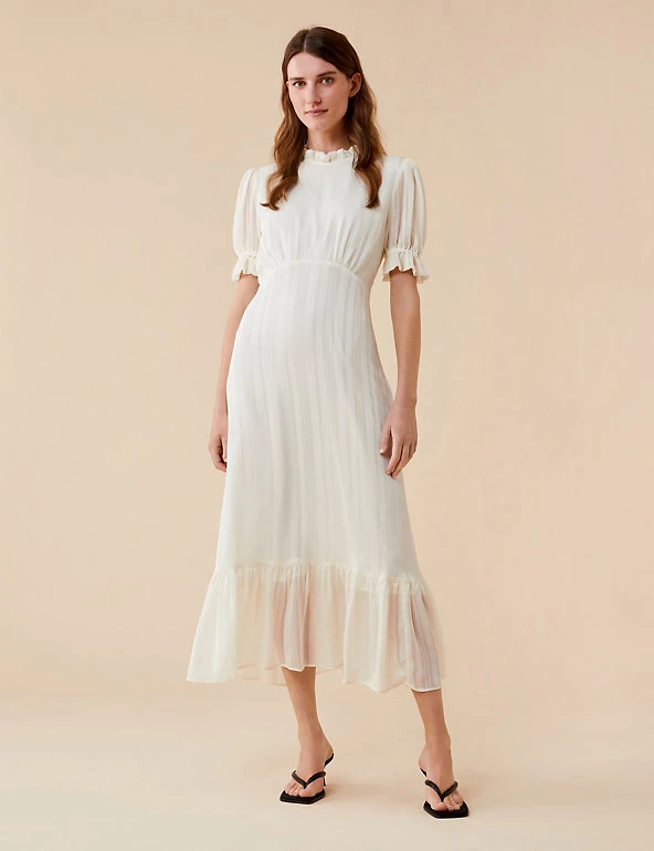 Bring a romantic feel to special occasions, with this flowing smock dress from Finery London. It’s cut in a comfortable regular fit, with a ruffled neckline, short puff sleeves and an under-bust seam that flatters your figure. The midaxi length hem is finished with a fluttery frill, and a keyhole button fastening at the back of the neck adds a delicate extra detail.