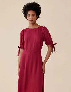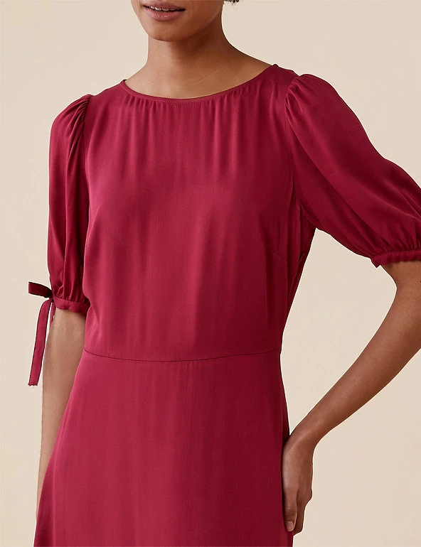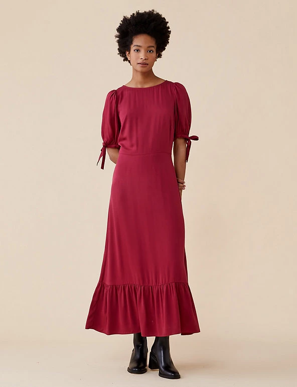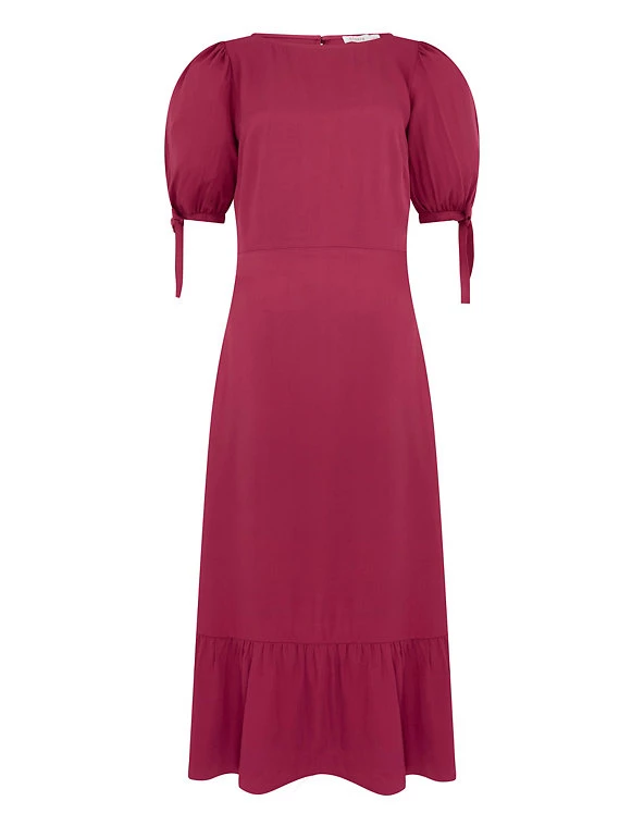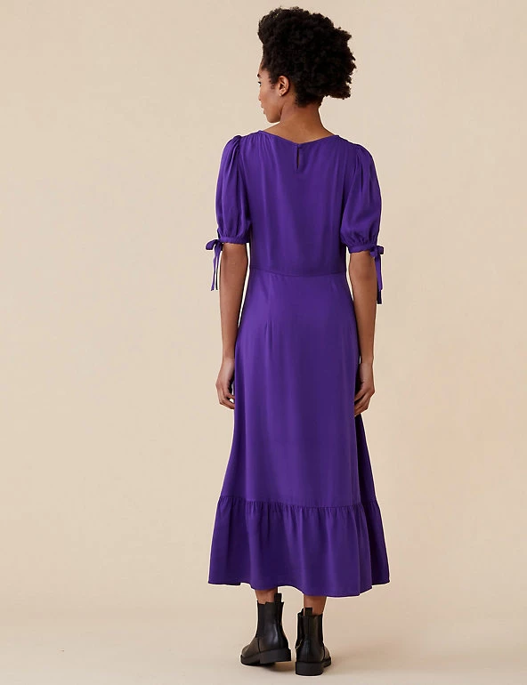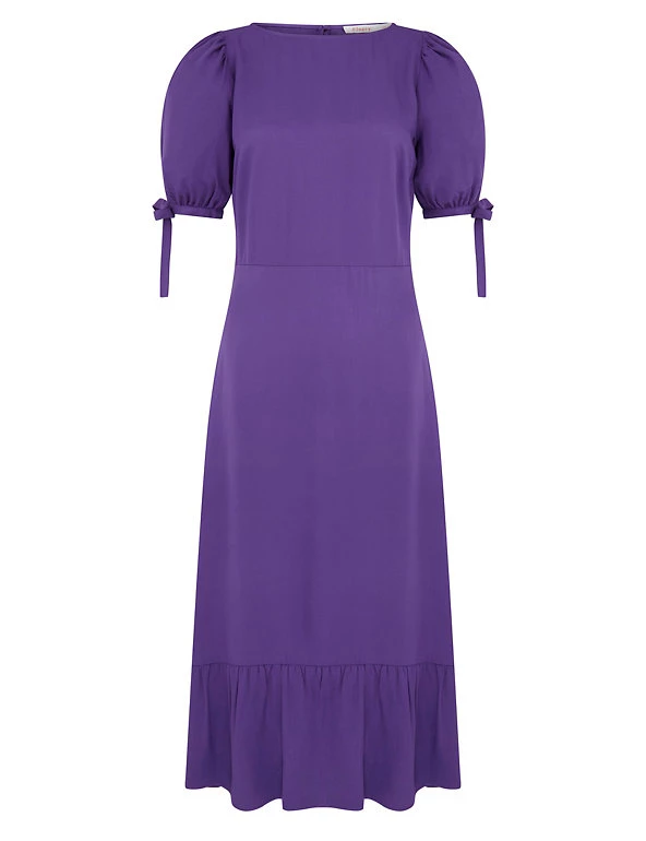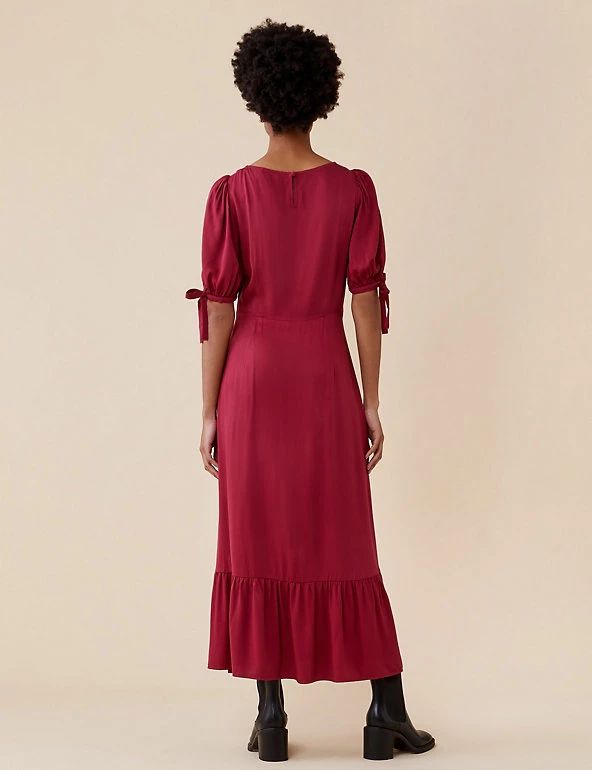 Tiered at the hem for a feminine silhouette, this midi tea dress by Finery London is a year-round wardrobe hero. It’s cut to a regular fit with a flattering empire waistline. The dress is framed with a round neckline and short puffed sleeves finished with pretty bows. A discreet zip fastening and keyhole opening at the back completes the piece.