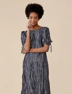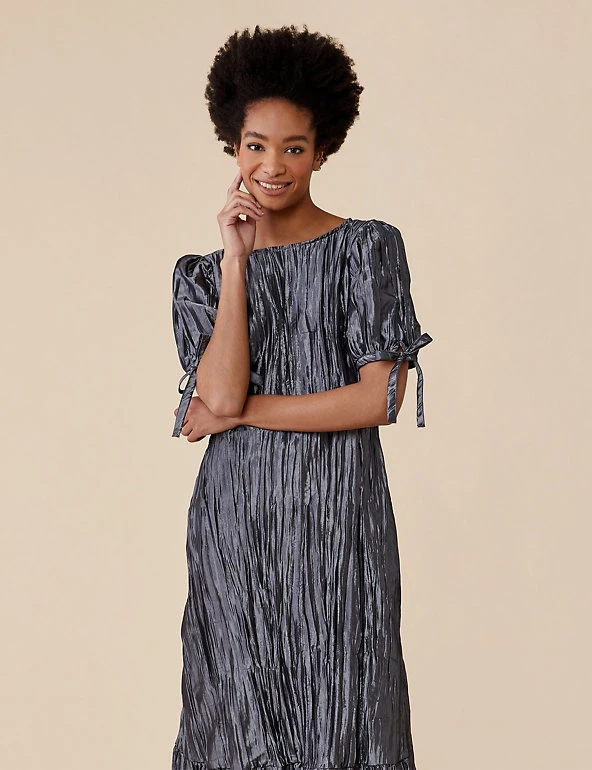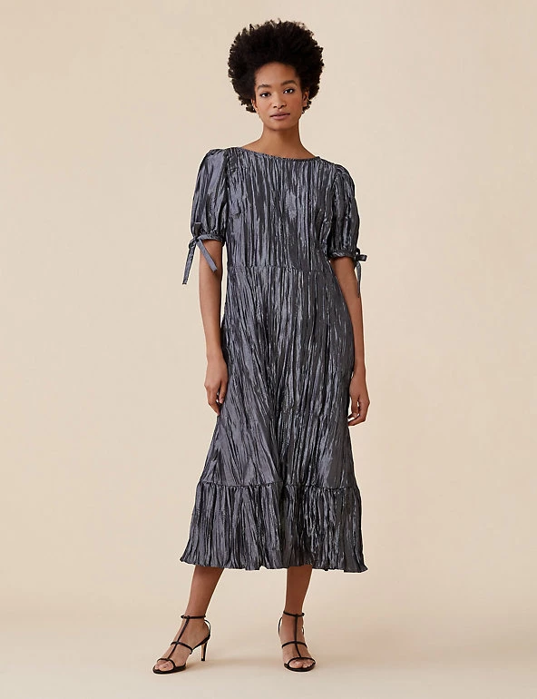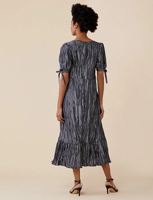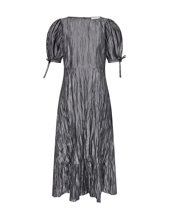 Opt for metallics this party season with this stylish Finery London dress. Cut to a regular shape, it features a simple round neckline and short puffed sleeves with tie detail finishes. Its midi-length skirt is designed with a floaty tiered hem for plenty of movement. A discreet back zip fastening completes this piece.