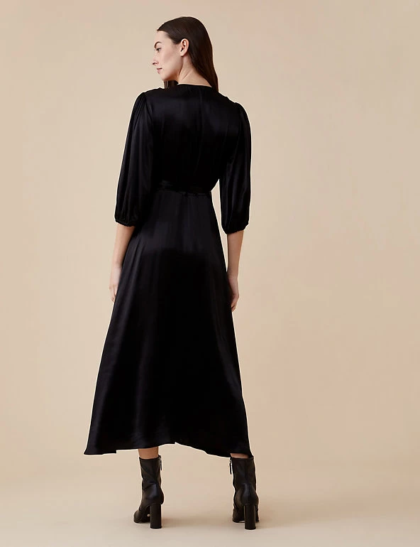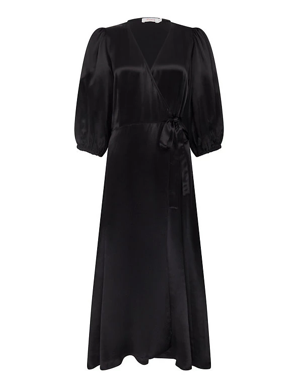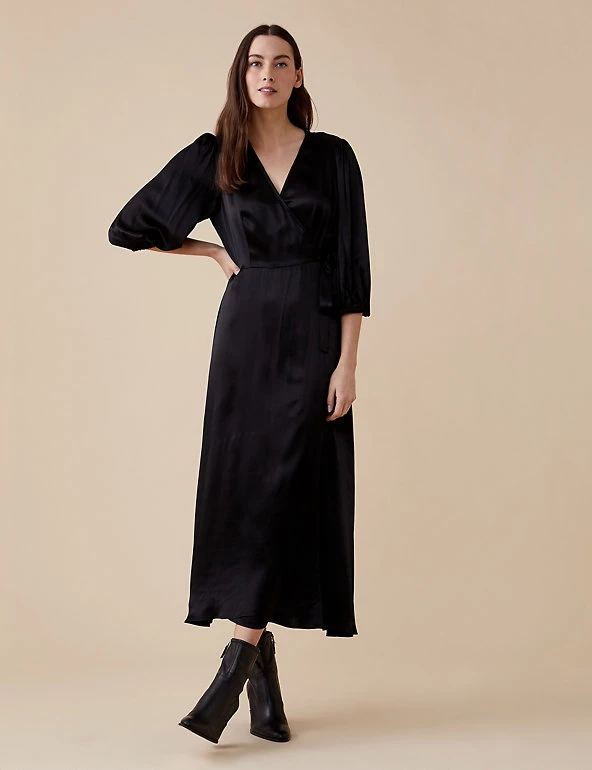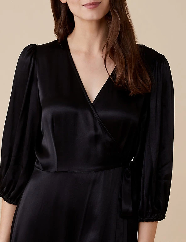 Opt for understated elegance on evenings out with this sophisticated wrap dress from Finery London. It’s cut to a regular fit, and the tie waist and flowing skirt create a flattering silhouette. This elegant number is crafted from satin-look fabric and falls to a versatile midaxi length. The v-neck and voluminous three-quarter sleeves add feminine flourishes.