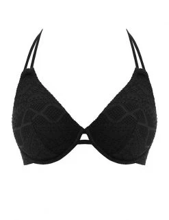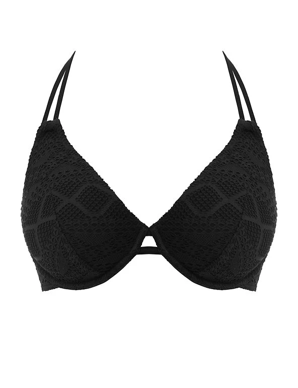 Make a splash on warmer days in this halterneck bikini top from Freya. It’s cut with a flattering low plunging neckline and features powernet-lined cups for a smooth shape. The skinny straps tie at the neck for an adjustable fit and feature luxe metal beads at the ends. This supportive underwired design features a clasp closure and pretty crochet overlays.