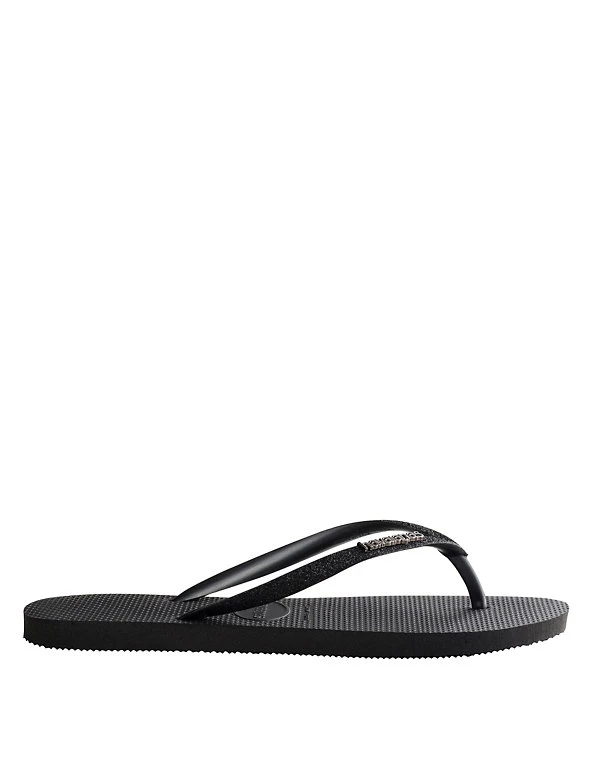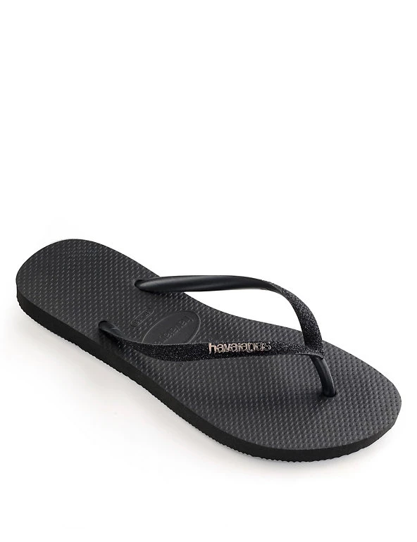 Add a little sparkle to your summer footwear with these glitter flip flops from Havaianas. Crafted in a regular fit, these flat sandals have a comfortable rubber sole and slim glittery straps with branding.