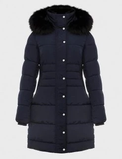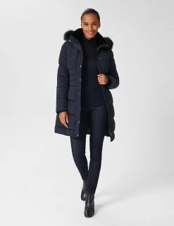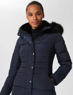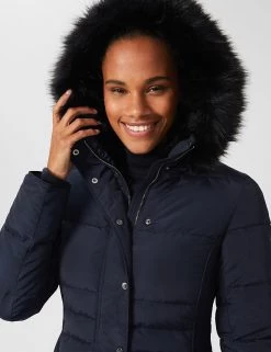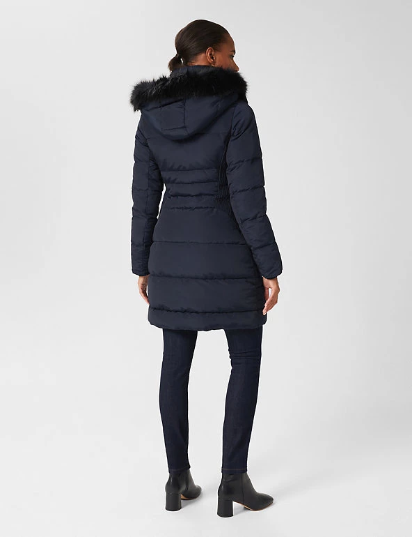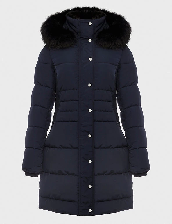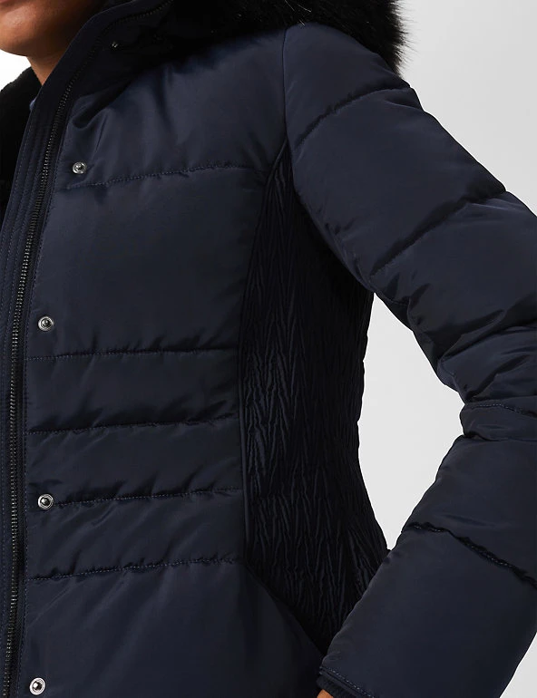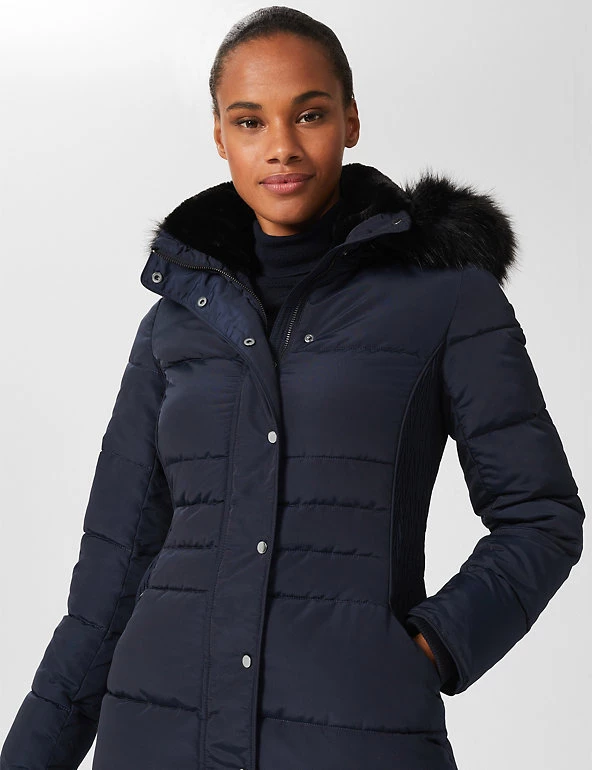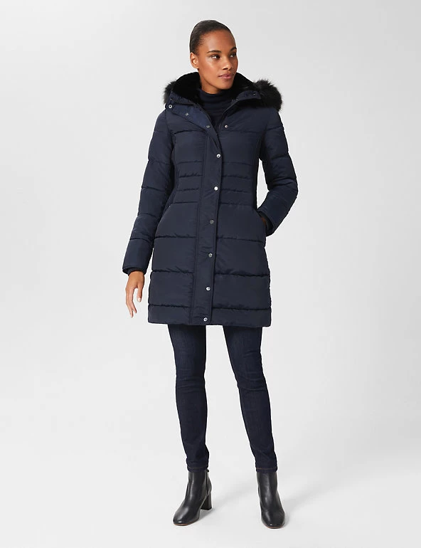 Update your cold-weather uniform with this cosy puffer jacket from Hobbs. It’s cut in a comfy regular fit to a longline length with a zip and snap button closure to lock in the warmth. The cosy hood features a faux-fur trim for stylish detail. Quilted panels make it super snug, while front pockets are ideal for storing essentials when on the move. Made with recycled polyester lining.