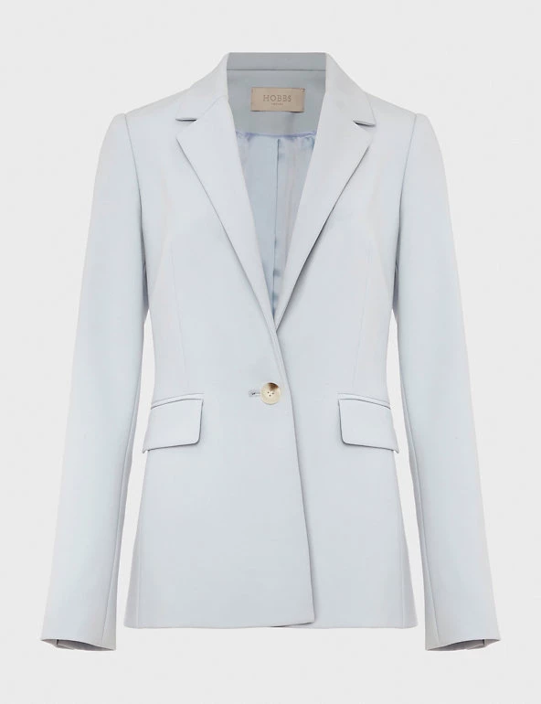 This impeccably tailored blazer by Hobbs will take your work wardrobe up a notch. It’s cut to a regular fit, with a modern single-breasted front and shaping through the bust and waist. Buttoned cuffs, flap pockets and a peaked lapel deliver a sharp look. Made with recycled polyester.