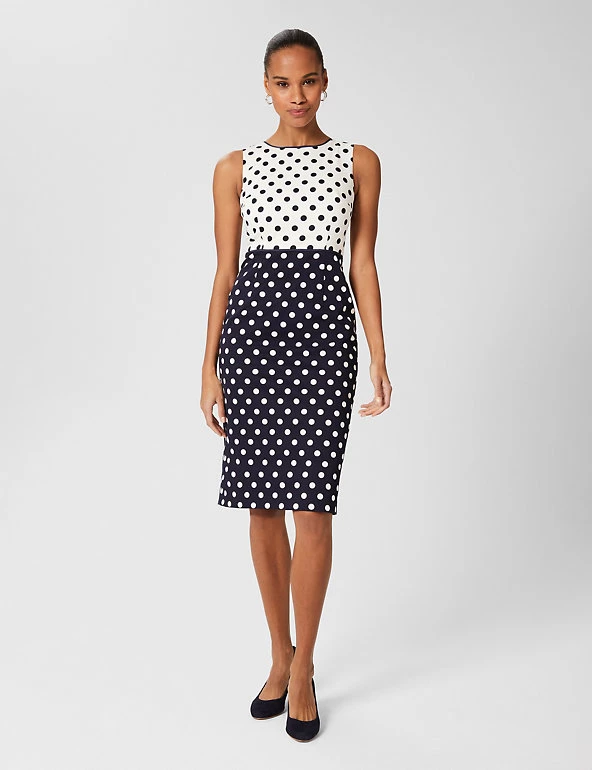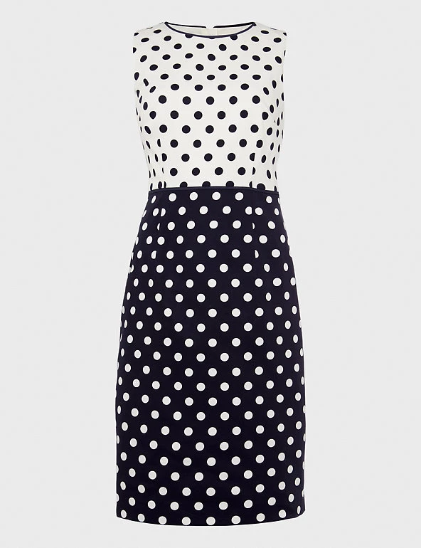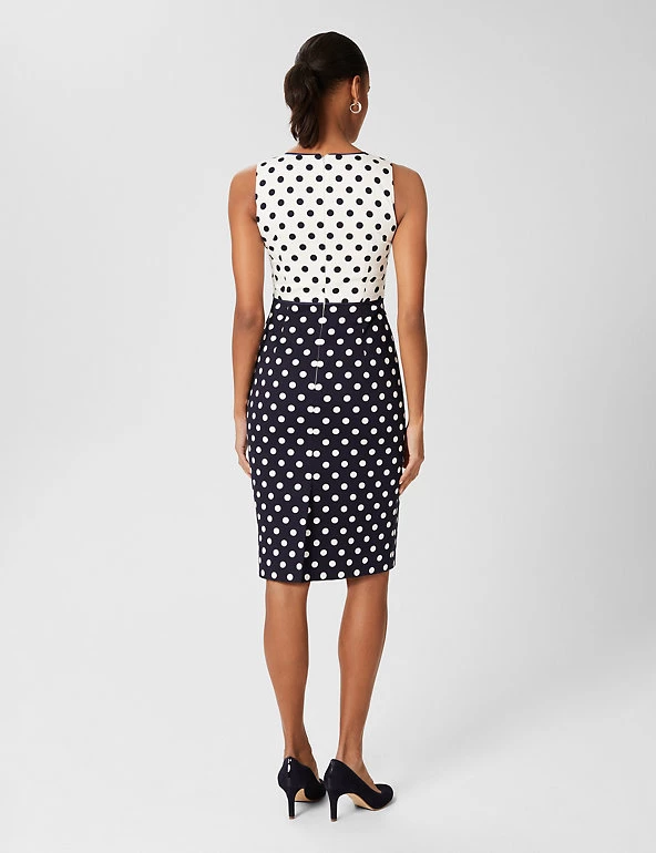 Stand out in bold polka dots with this eye-catching dress by Hobbs, made from cool, cotton-rich fabric. This sleeveless occasion dress is cut to a regular fit, with a flattering waisted silhouette and straight, knee-length skirt. The bodice and skirt are decorated with polka dots in contrasting colourways. Added stretch in the fabric ensures this piece feels comfortable for all-day wear. It fastens with a zip at the back.