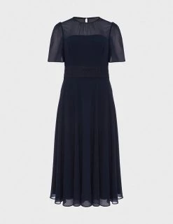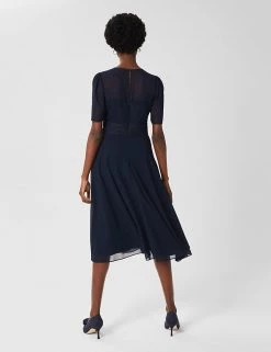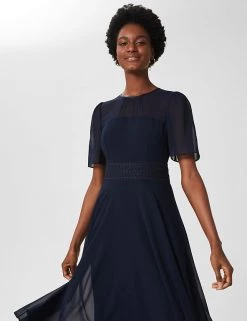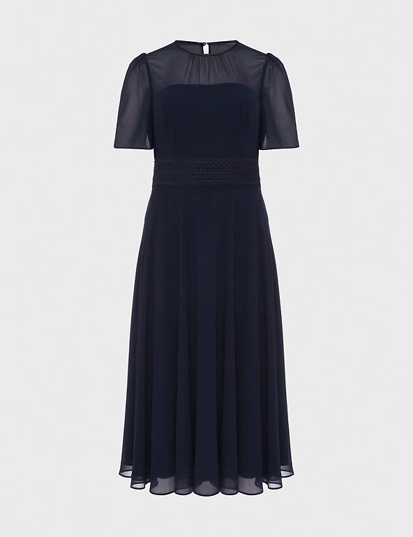 Look to this skater dress from Hobbs for a fresh take on feminine style. This effortless piece is cut to a regular fit, with a classic round neck and an on-trend midi-length hem. Semi-sheer shoulders and short sleeves add a romantic touch, while an embroidered waistband brings extra texture and detail. This style fastens with a concealed zip and keyhole button at the back. Made with recycled polyester lining.
