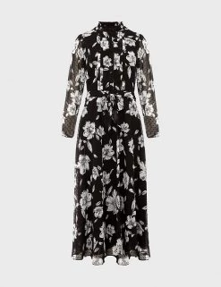 This floral skater dress from Hobbs is ready for any occasion. It’s crafted in a regular fit for effortless appeal, with a romantic frilled neck and flattering waist tie. The on-trend midi hem is gently flared for extra volume. A subtle polka dot background and long semi-sheer sleeves give this piece an evening-ready finish. Covered button fastenings add a premium touch. This dress is lined for comfort. Made with recycled polyester lining.