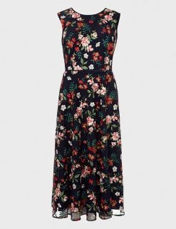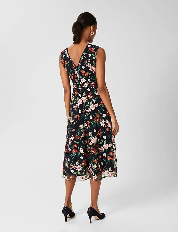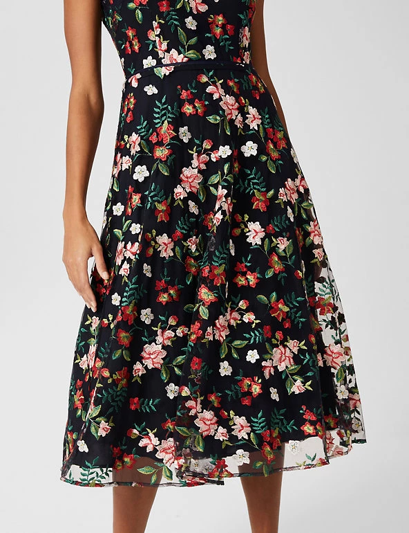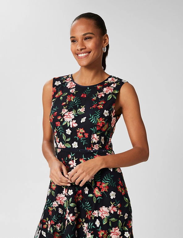 Flourish in florals at your next event with this vibrant dress by Hobbs. It comes in a regular fit, with a flattering fit-and-flare silhouette that falls to a midi length. This sleeveless dress blooms with flower embroidery designed exclusively in the brand’s London studio. There are plush satin trims around the neck and waist for a refined look. A v-back adds the final stamp of elegance to this design.