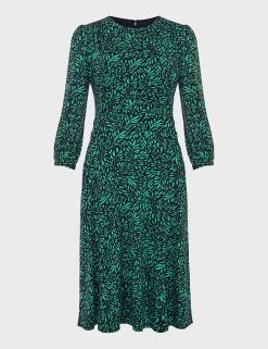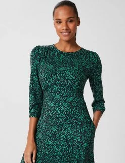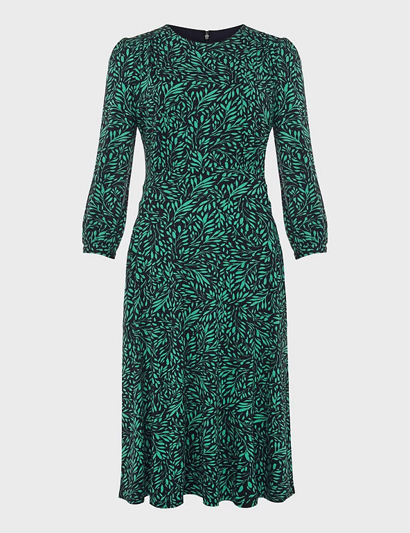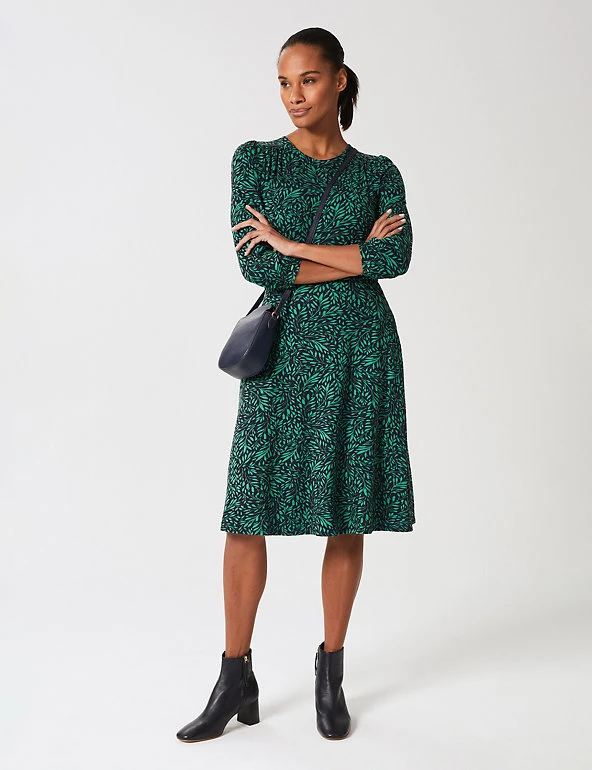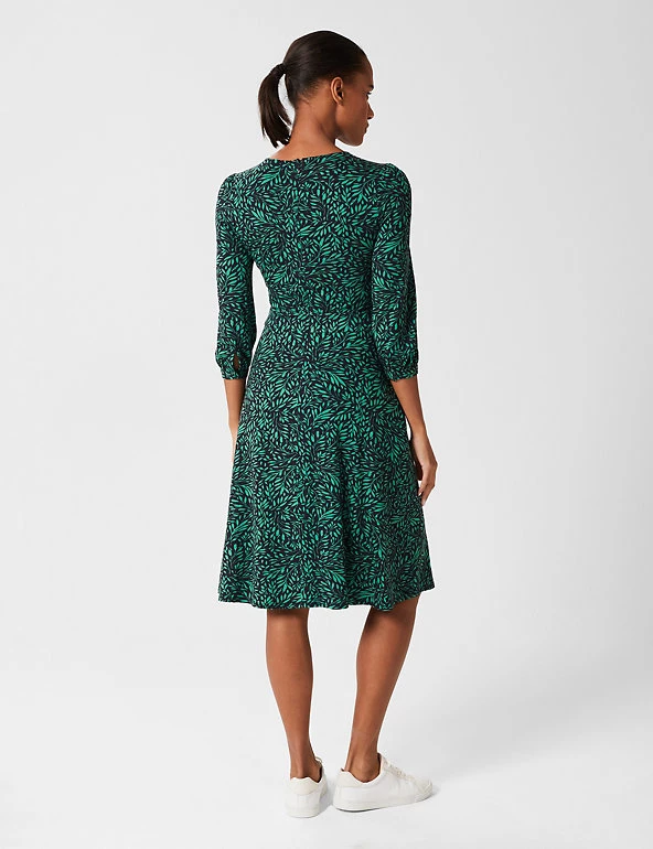 This jersey dress from Hobbs is an ideal day-to-evening piece. It’s cut in a comfortable regular fit, with a round neckline and a flattering waist panel that highlights your figure. An all-over leaf print gives a fresh look. The three-quarter sleeves are gathered at the shoulders and cuffs for a touch of extra volume, and pockets at the hips provide useful storage. The hemline finishes at a versatile knee length. This dress fastens with a back zip.