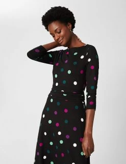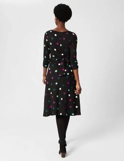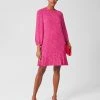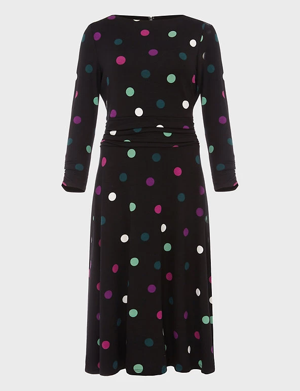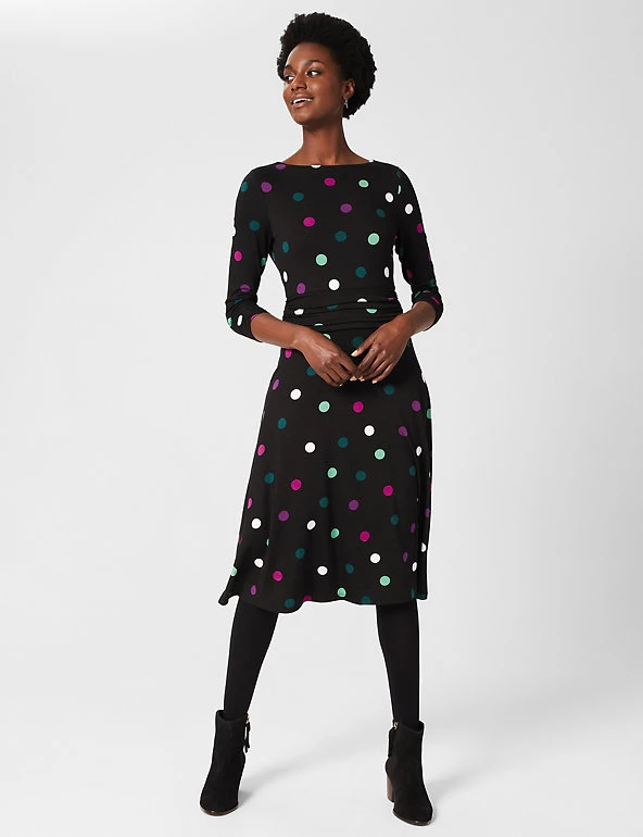 Adorned with multicoloured spots, this Hobbs dress is a playful number you’ll wear on repeat. The knee-length design is cut in a regular fit with a skater skirt for a flattering silhouette. Ruching on the waist and a tie at the back further accentuate your figure. Its three-quarter sleeves are finished with feminine gathered cuffs. It fastens with a discreet zip at the back.