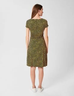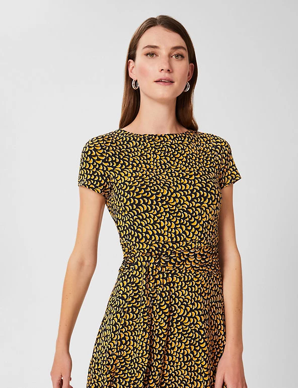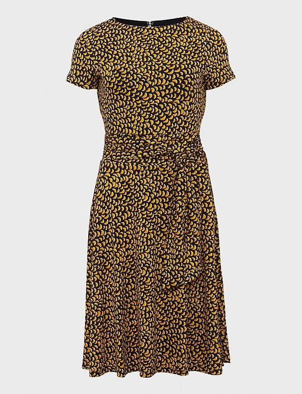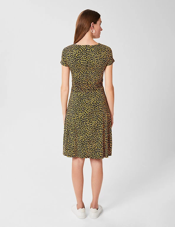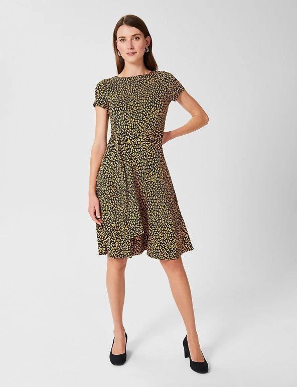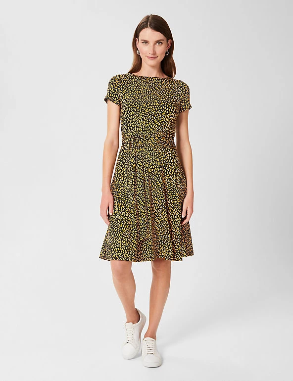 Comfy jersey fabric and an elegant swing silhouette come together to create this versatile dress by Hobbs. It’s crafted in a regular fit, with short sleeves, a round neck and a tie belt to highlight the waist. This dress has an attractive geometric print and the skirt falls to a swishy knee length. A neat back zip fastening completes this design.