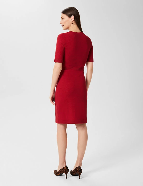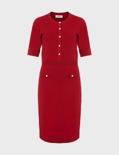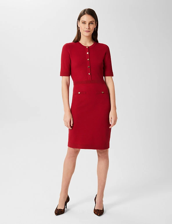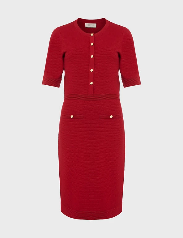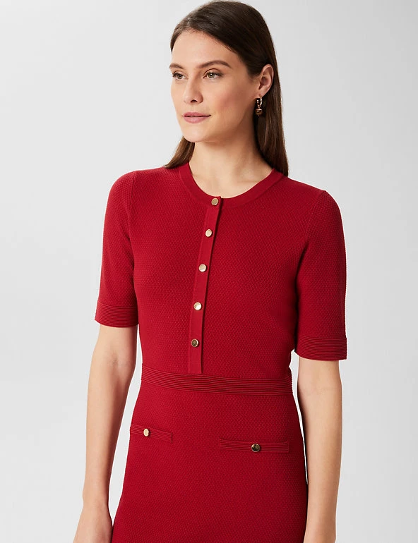 This jumper dress from Hobbs is the ultimate blend of comfort and sophistication. Cut to a regular fit, it’s framed with a simple round neckline and short sleeves. The dress is falls to the knee for an elegant look and features ribbing on the waist to highlight your shape. It’s finished with gold-button detailing for a touch of glamour. Made with sustainably sourced viscose.