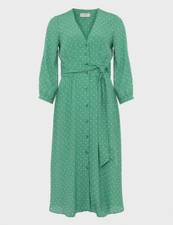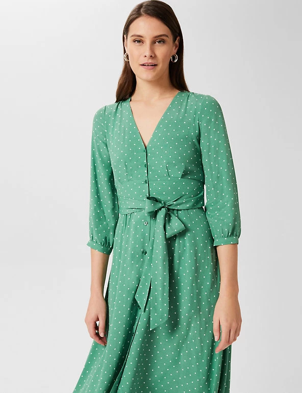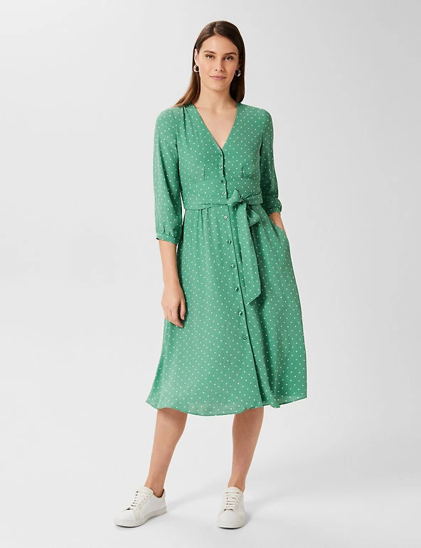 This pretty shift dress by Hobbs exudes charm with its classic polka-dot print. Cut to a regular fit, it drops to a sophisticated midi length. It features a flattering low v-neckline, contemporary button-through closure and smart three-quarter sleeves. A self-tie belt at the waist draws in your figure for a flawless look. Made with sustainably sourced viscose.
