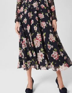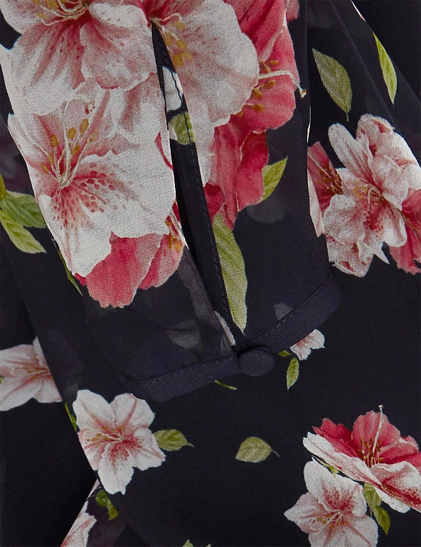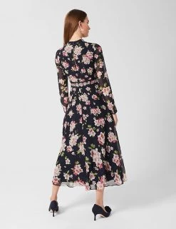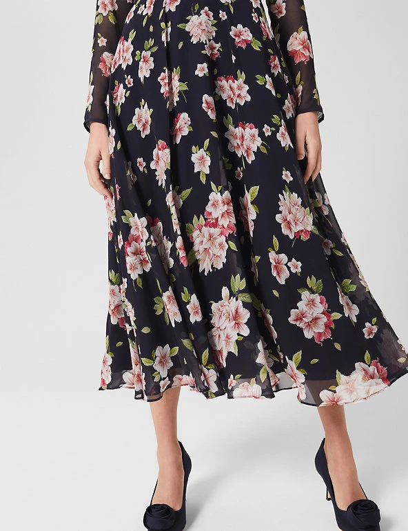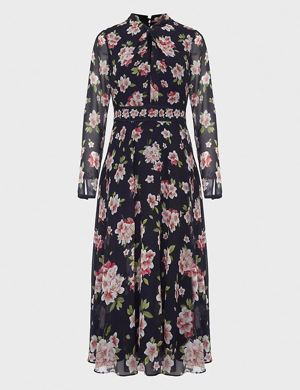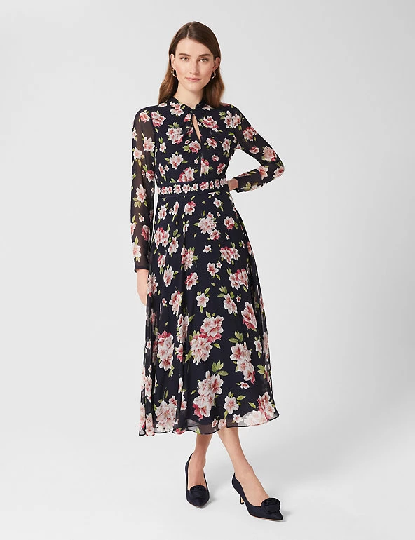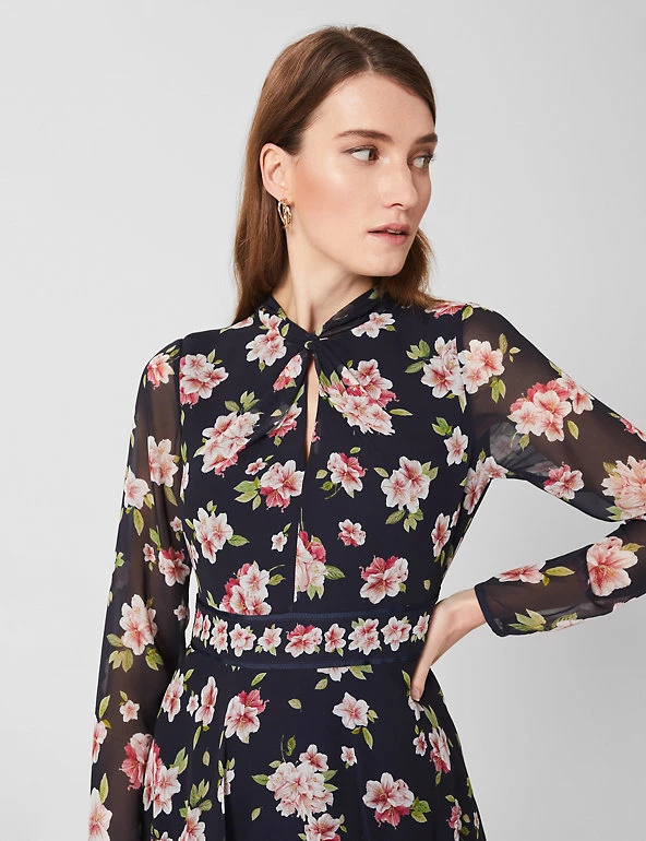 Luxurious pure silk and an all-over azalea print make this Hobbs dress a head-turning choice for special occasions. This long-sleeved piece comes in a regular fit, with a contrasting floral waistband. The gently gathered skirt is semi-sheer and falls to a midi length. A twist-knot detail and keyhole feature at the neck add the final stamp of elegance. The dress fastens with a neat back zip and is lined for comfort.