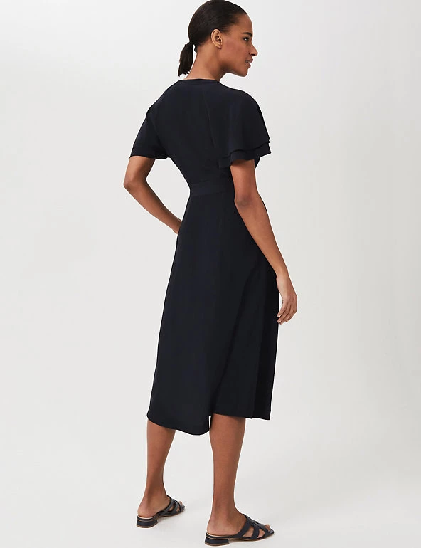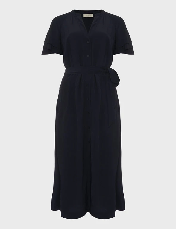 Meet your new wear-anywhere LBD by Hobbs. This versatile midi dress comes in a regular fit, with a button-through front and drapey skirt. A detachable tie belt lets you define your waist as desired. Plus, double-frill raglan sleeves bring extra volume to the slender silhouette. It’s complete with handy slip pockets at the hips.